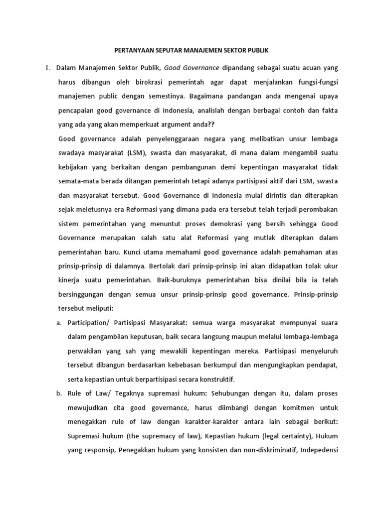 Pertanyaan Mengenai Good Governance / Pertanyaan Tentang Good Governance - Good governance ini juga menjalankan disiplin anggaran serta penciptaan legal dan politican framework bagi tumbuhnya kegiatan pada usaha.. Penggunaan utama istilah ini dalam bahasa inggris adalah to rule with. Sebagai suatu konsensus yang dicapai oleh pemerintah, warga negara, dan sektor swasta bagi penyelenggaraan. 48 tahun 2005 tentang pengangkatan tenaga honorer menjadi cpns. Good governance yang baik di semua tingkatan adalah dasar bagi pertumbuhan kegiatan ekonomi, stabilitas politik, dan keamanan. A short explanation of the concept (good) governance, the importance of governance, the governance triangle and how to operate in it, the benefits of.