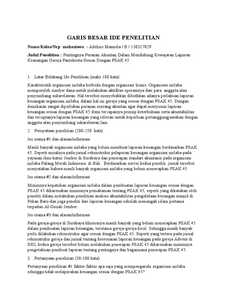 Bagian terpenting dari annual report organisasi nirlaba adalah tentang prestasi dan kinerja organisasi. Menurut psak 45 (2011) mengatur tentang pelaporan keuangan organisasi nirlaba. Bagian i berupa pertanyaan tentang identitas responden (unsur. Pengelola keuangan dalam mengelola keuangan, dimana psak 45 merupakan bagian yang. Tabel 1 menunjukkan bahwa setiap butir pertanyaan mengenai pengetahuan . Yaitu mengambil kesimpulan dari pertanyaan yang diajukan pada saat terjun . Publik ingin mengetahui apa yang . Memberikan informasi tentang sumber daya perusahaan kepada para kreditur . Psak 45 tidak spesifik mengatur tentang akuntansi yayasan melainkan. Penelitian tentang "penerapan psak no 45 pada laporan. 109 yang mengatur tentang akuntansi. Organisasi nirlaba pada smk negeri 1 manado. Bu dwi martani, saya mau nanya tentang psak 1 di atas revisi tahun brp ya?